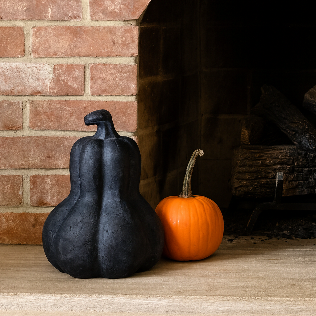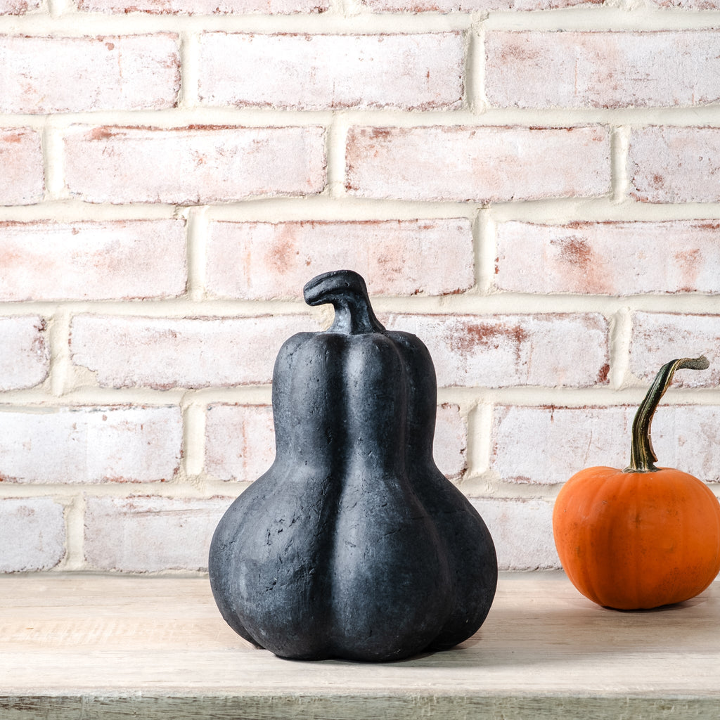 This 10-inch black terracotta gourd brings a bold, moody twist to traditional autumn decor. With its sculptural silhouette and matte charcoal finish, it’s a standout piece for Halloween styling or modern fall vignettes. Whether displayed on its own or grouped with pumpkins and candles, this gourd adds a sophisticated seasonal edge.