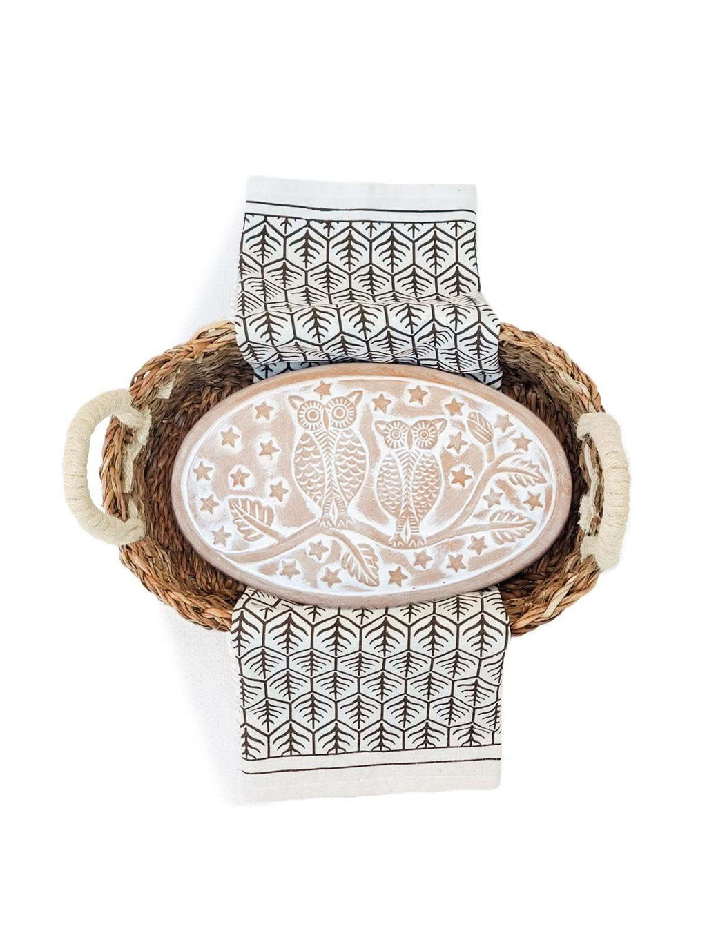 Add a bit of artisan-inspired style to the kitchen with a terracotta bread warmer and hand screen printed tea towel. Engraved with an owl design and cut to fit neatly into an oval basket, this terracotta special bread warmer is naturally insulating, and the basket itself has been handwoven from sustainably grown seagrass. The tea towel is great for drying dishes or hands in the kitchen, lining a bread basket. They are the best gift items for anyone who loves bread!