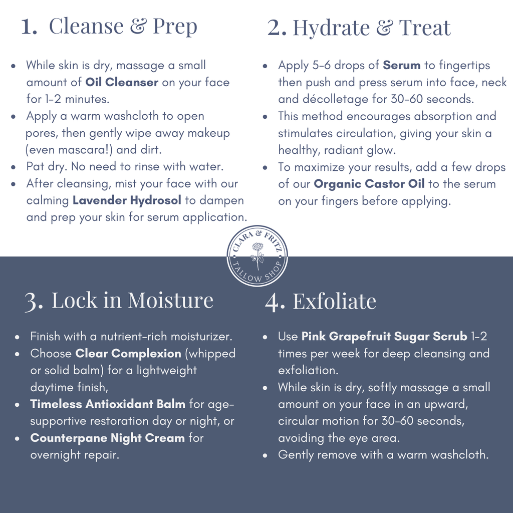 Use alone or layer under Clear Complexion Whipped Tallow Facial Moisturizer, Timeless Antioxidant Balm, or Counterpane Tallow Night CreamGentle enough for all skin types.